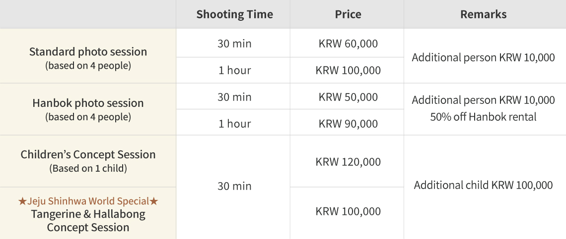 Nuvo Studio, a professional outdoor snap photography studio, has newly opened at Jeju Shinhwa World! Immortalize your special moments amidst the exotic scenery of Jeju Shinhwa World with your family, friends, or loved ones. Featuring design-patented baby concept photography, Nuvo Studio offers unique and creative themes inspired by Jeju’s local culture—such as Haenyeo (female divers) and Hallabong (Jeju oranges)—for a truly one-of-a-kind photo experience. You can also visit Winkles Hanbok Rental Shop, which offers a wide selection of hanbok in various sizes and styles. Experience the beauty of traditional Korean attire, known for its elegant lines and vibrant colors, and create memories that last a lifetime. ▶ Rate Information