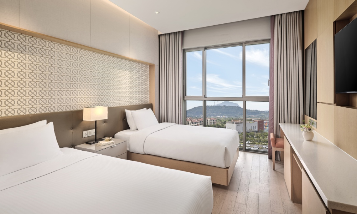 있는 킹 베드와 조명, 실내 온도를 손쉽게 조절할 수 있는 스마트 컨트롤 시스템을 갖춘 모던 스타일 객실입니다. 심플한 베이지톤