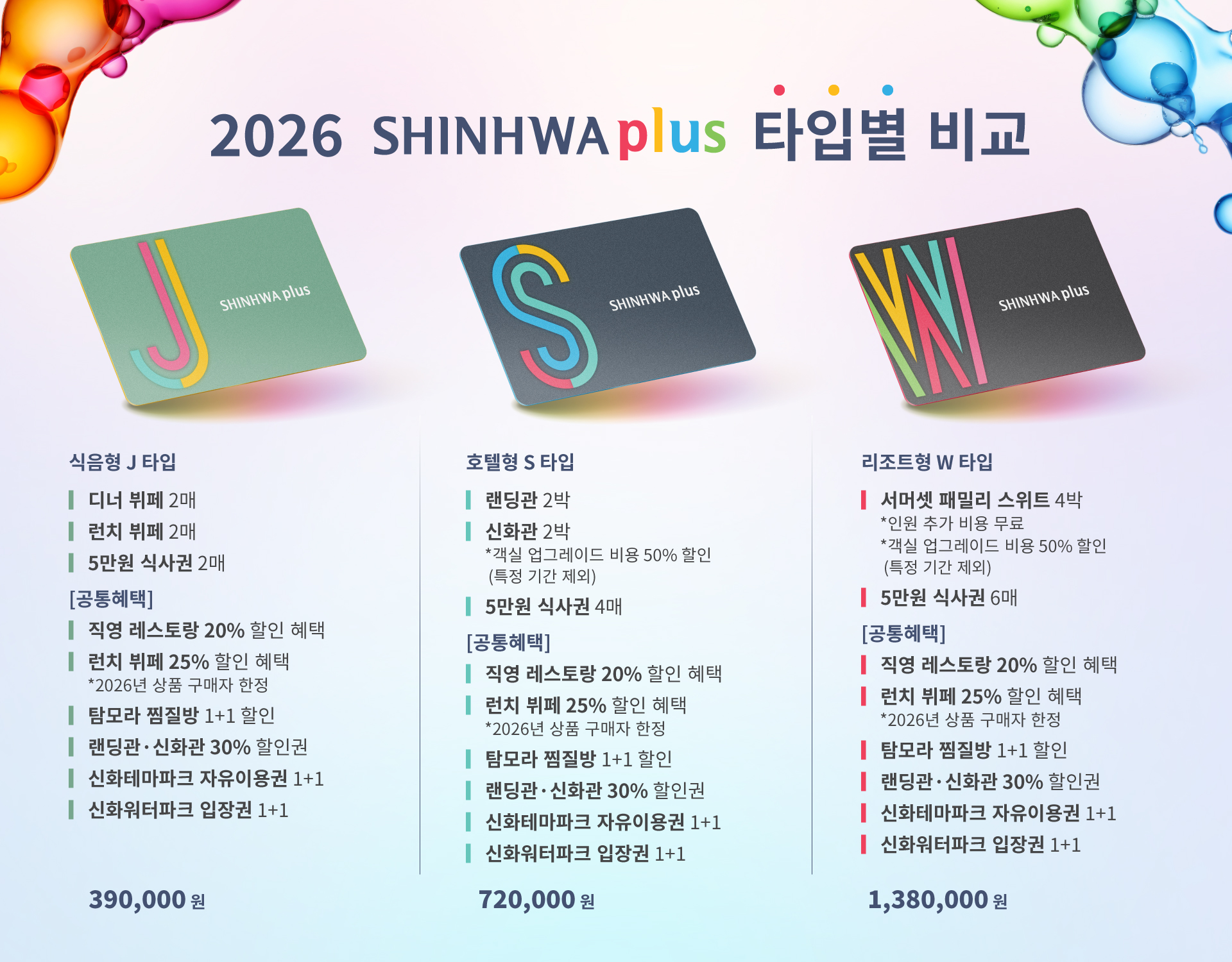 - 패밀리룸 또는 상위 타입 업그레이드 비용 할인 혜택은 2026년 신화플러스 숙박권 전용 혜택입니다.