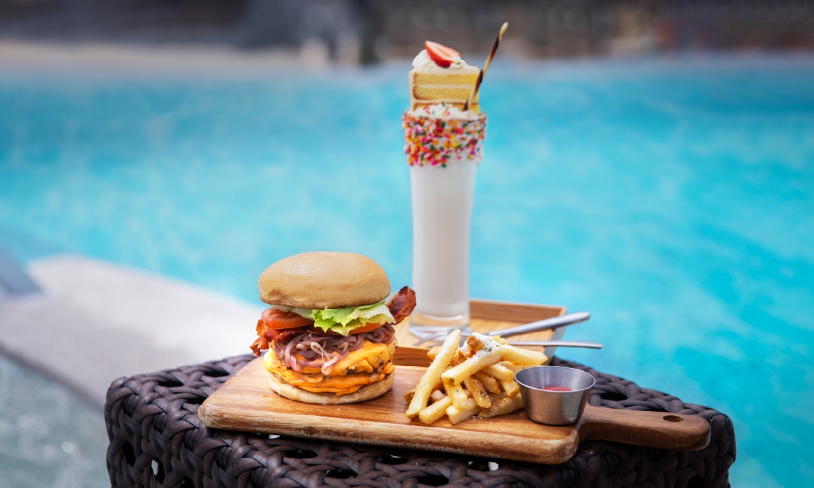 在充滿異國情調的屋頂酒吧「天空酒吧」一邊悠閒地用餐,一邊欣賞美景。享受全天的優質餐飲服務,享用經典的招牌漢堡和彩虹奶昔、美味的披薩和鮮嫩雞肉,以及新鮮生啤酒、各式雞尾調酒、葡萄酒等…..豐富多樣的選擇、。天空酒吧不僅為神話天際泳池的客人提供優質餐飲服務,更為那些只想要在美麗的濟州日落下享受悠閒用餐的人們,提供難以忘懷的美食新體驗。