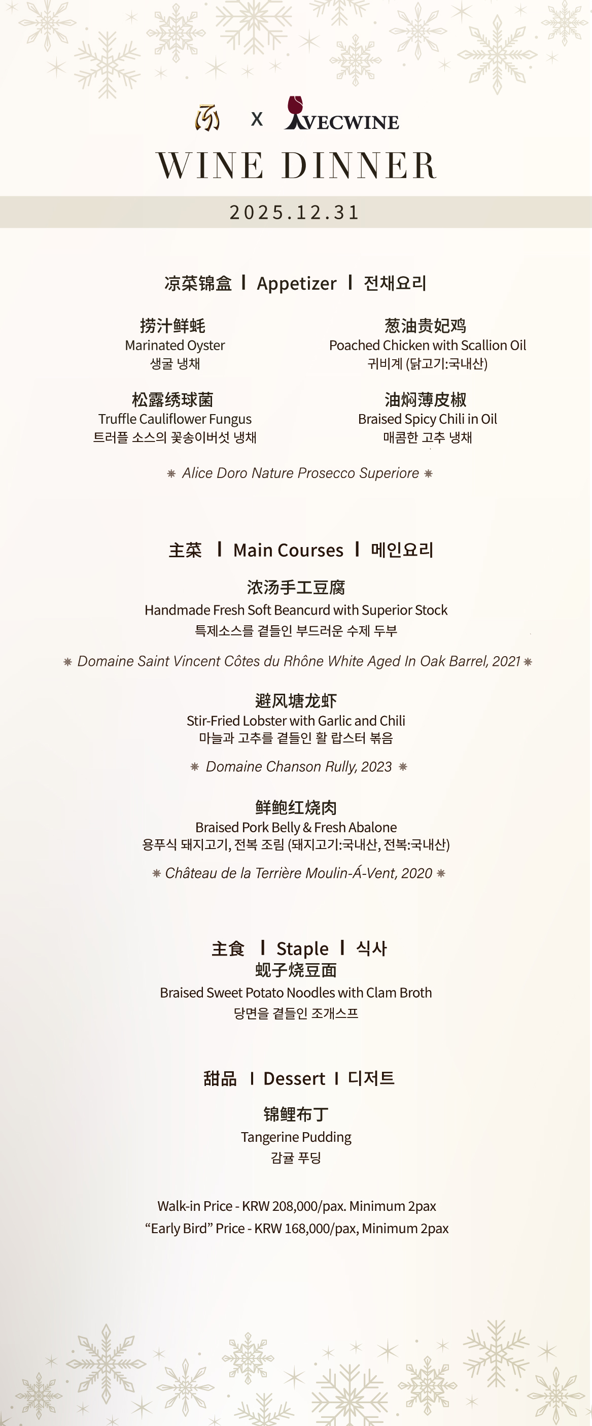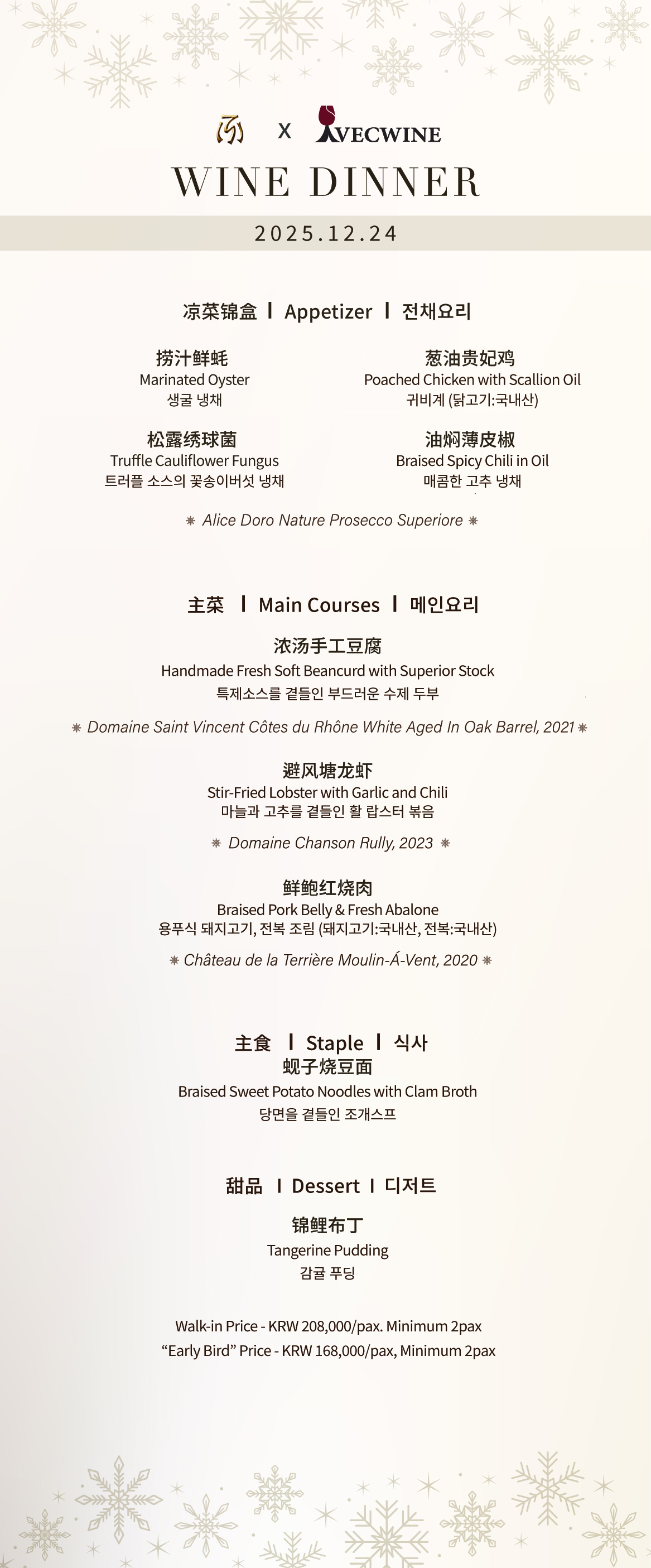 今年年末,榕福家宴与欧洲高级葡萄酒进口商 Avec Wine 合作,为您准备了非凡的美食之夜。享用经过精心搭配的葡萄酒,搭配榕福家宴的招牌菜和手工特制菜肴,体验更深层次、更丰富的美味。沉浸在温暖舒适的氛围中,品味美食与美酒融合的真正难忘的时刻,庆祝岁末。