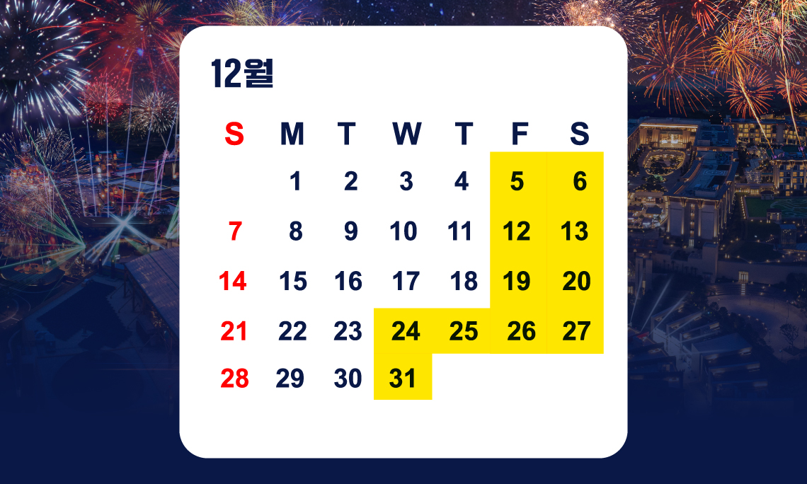 밤하늘을 아름답게 물들이는 라이팅쇼와 불꽃놀이를 즐겨보세요.