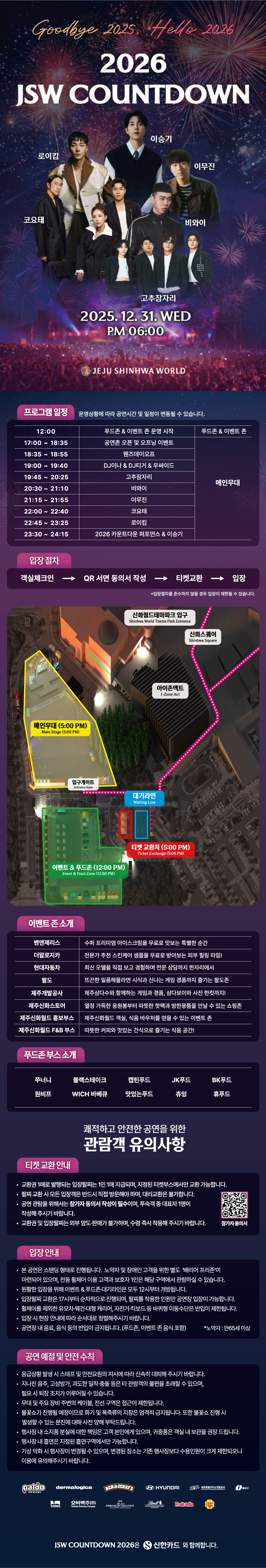 음악과 함성이 하나로 어우러지는 이곳에서 새해의 첫 카운트를 외쳐보세요. ※본 행사는 12월 31일 제주신화월드 투숙객 전용으로,