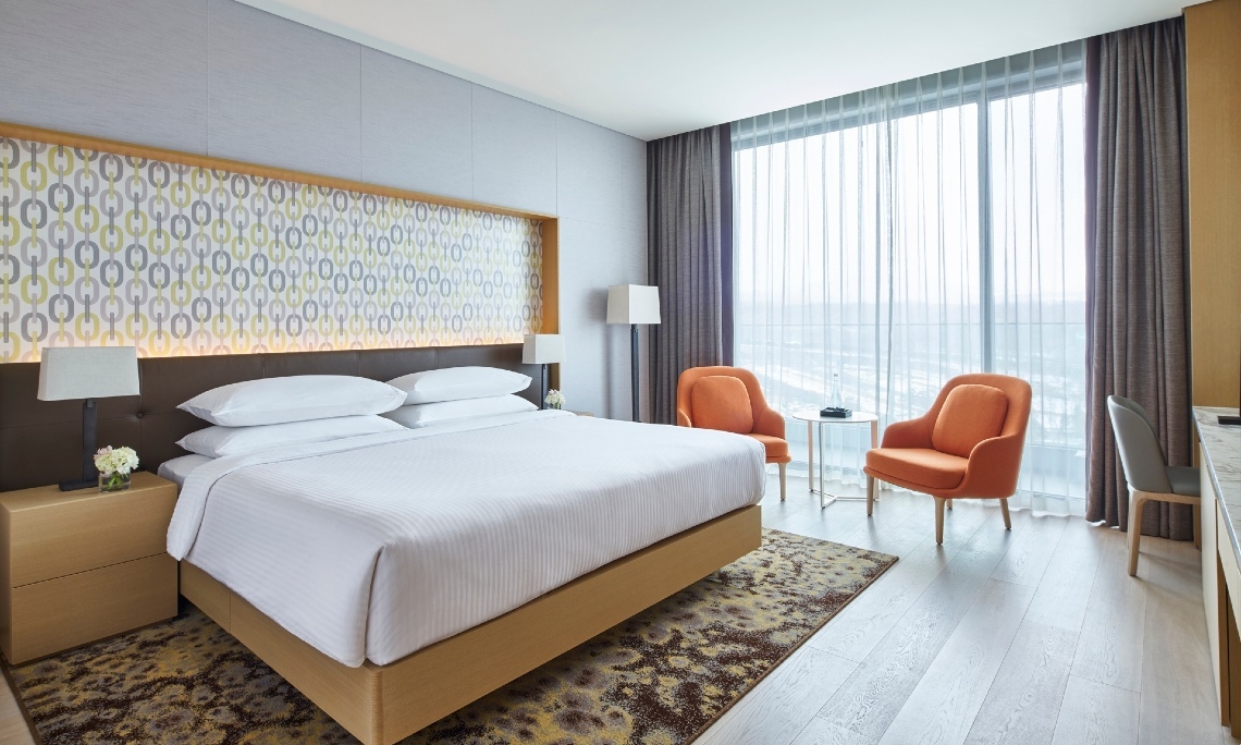 萬豪酒店的高級大床房,附有陽台提供您愜意寬敞的休息空間,特大尺寸大床,柔軟舒適的寢具,為賓客提供最宜人的休憩環境。客房內備有提供各種飲料的迷你吧、55英吋智能電視讓您一目了然地查看度假村訊息,一鍵可調的智能照明輕鬆營造出各種温馨氛圍。獨家精選英國睡眠專家”ThisWorks”的沐浴用品,清新天然植物香氛盡享優質的沐浴體驗,絶對是您身心放鬆的理想選擇。