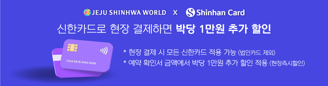 제주신화월드 공식 파트너 브랜드, 신한카드와 함께 제주신화월드의 다양한 즐거움과 특별한 혜택을 누리세요! 제주 최대규모를 자랑하는 신화워터파크부터 익사이팅한 놀이기구들을 갖춘 신화테마파크, 세계인의 입맛을 사로잡는 다이닝까지. 제주신화월드에서 편안한 휴식과 함께 일상 탈출의 기쁨, 잊을 수 없는 즐거움을 만나보세요!