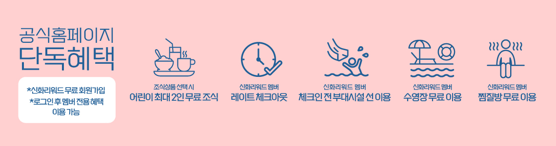 - 신화리워드 멤버 혜택은 [무료 회원가입/로그인] 후 랜딩관, 신화관, 서머셋 예약 시 적용됩니다.