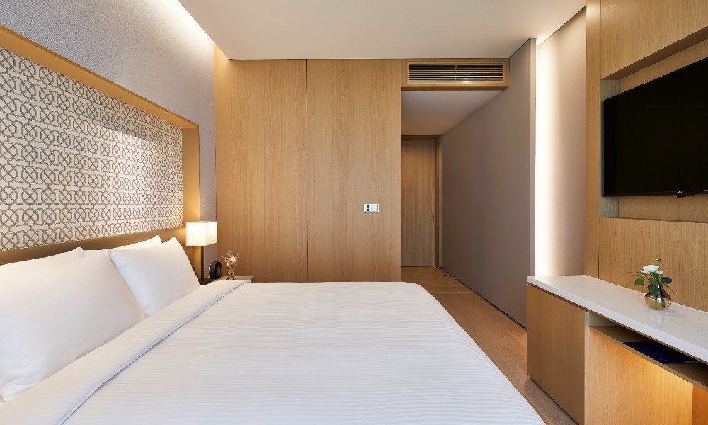 5階、6階の客室では、臨場感溢れるウォーターパークが一望できます。キングサイズの広いベットを中心に、ウッドカラーの家具やシンプルな壁紙と装飾を使っておしゃれなインテリアを完成させました。快適な睡眠をサポートする寝具に、室内温度や照明を簡単に調節できるスマートシステムも取り入れました。USBポート、Wi-Fiなどの便利なサービスはもちろん、浴室アメニティとしてビタミンとオメガ成分が豊富なバオバブの木のオイルをふんだんに使ったバスグッズを提供します。このルームタイプはスカイプールで繰り広げられるDJのライブ音楽を一緒にお楽しみいただけます。