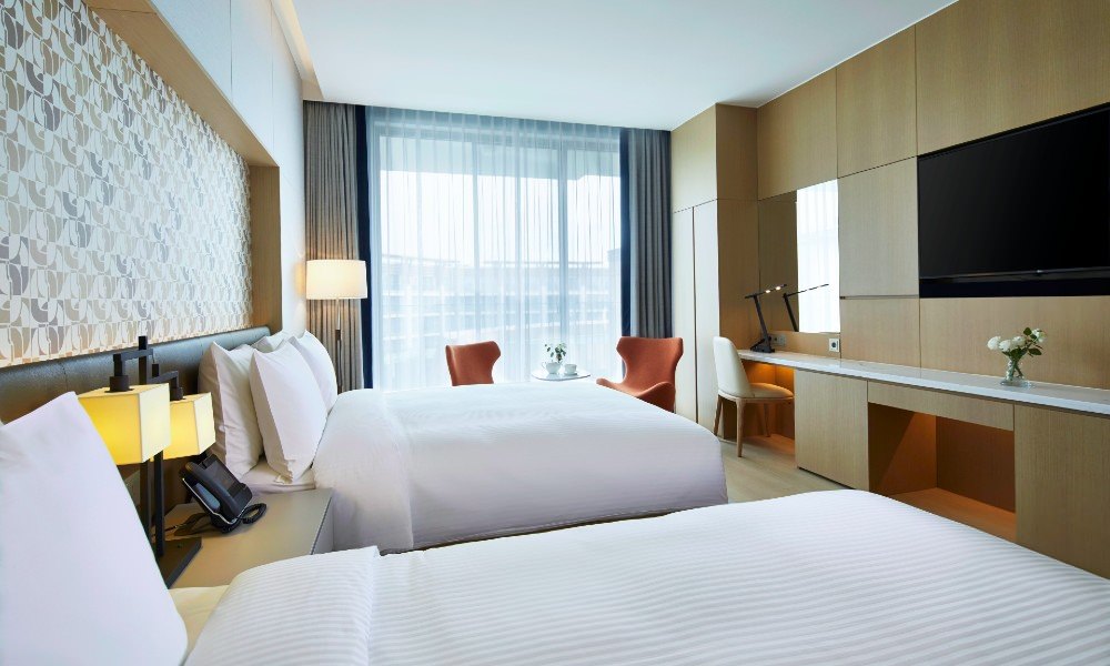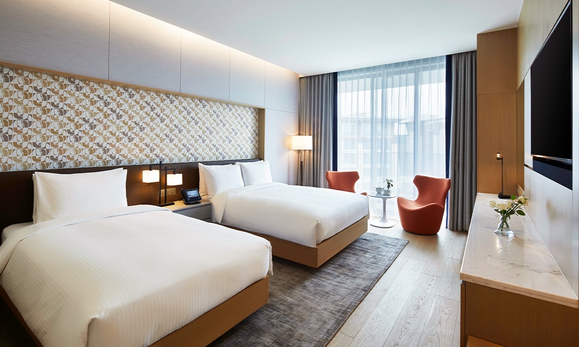 5階、6階にある客室の窓から見下ろすコートーヤードーが、お客様の心を落ち着かせてくれるでしょう。家族旅行に最適なクイーンベッドとシングルベットに、ウッドカラーの家具やシンプルな壁紙と装飾を使用し、おしゃれなインテリアを演出しました。さらに、ゆったりとした休息をとっていただくために贅沢な寝具を採用しております。 室内温度や照明を簡単に調節できるスマートシステムを取り入れ、USBポート、Wi-Fiなどの便利なサービスを加えました。また、浴槽と洗面台がある空間とトイレ、シャワーブースを分けてお客様の便宜を図りました。浴室アメニティとしてビタミンとオメガ成分が豊富なバオバブの木のオイルをふんだんに使ったバスグッズを提供いたします。