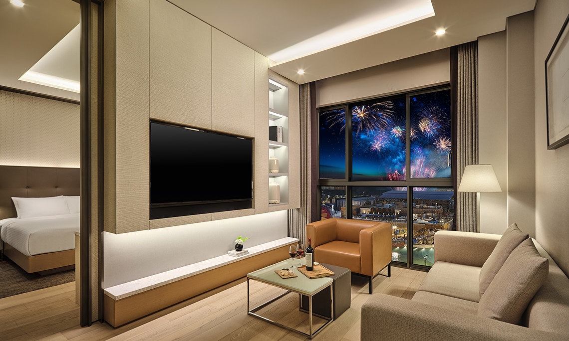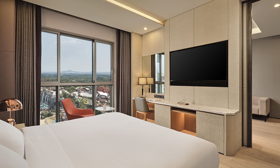 神話リゾート・スペースのジュニアスイートからは、神話リゾート・スペースと神話ウォーターパークを一望できます。さらに、遠く済州南西側の海も楽しめる最高のビューが自慢です。ウッドカラーの家具と優しい照明が調和した寝室は、スイートならではの快適で贅沢な休息をお楽しみいただけます。寝室と分離された居心地のよいリビングには豪華なソファーとテーブルがあり、軽いスナックとドリンクなどをお楽しみいただけます。また、お子様がいらっしゃるお客様のために、コネクティングルームもご用意しております。「Galrtem」のアメニティで贅沢なバスタイムを満喫してください。バスタブのそばにあるガラス